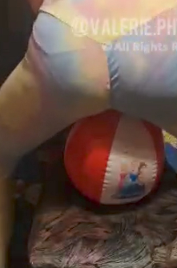 Two small beach balls burst by a sexy ass