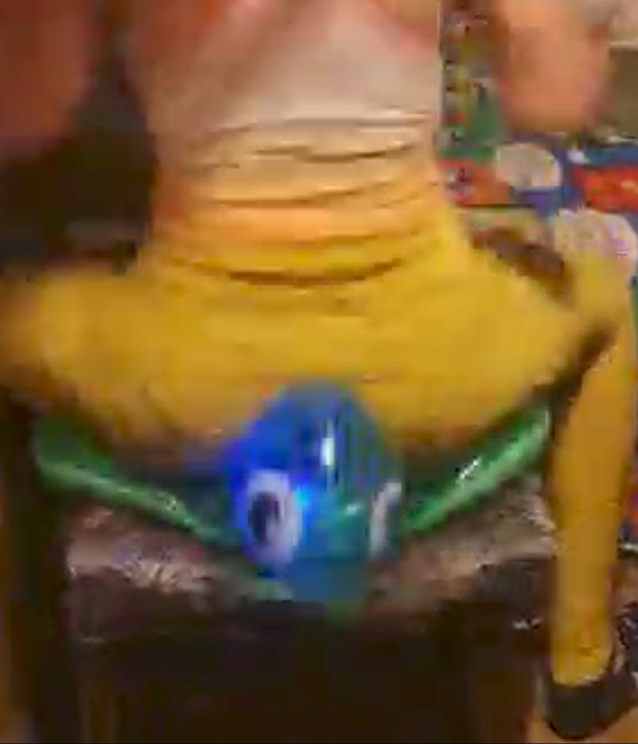 Two inflatable green turtles exploded under a sexy ass