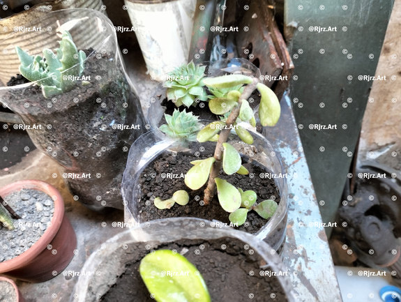 Pianta succulenta in vasetto riciclato da bottiglie in plastica.