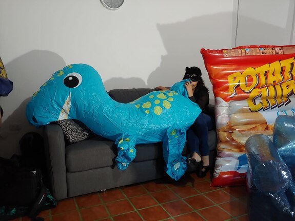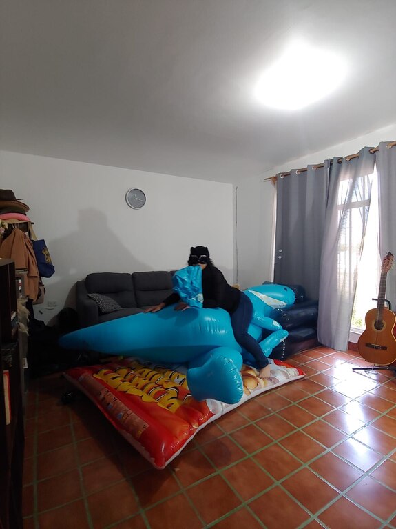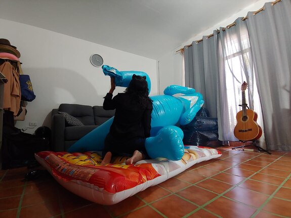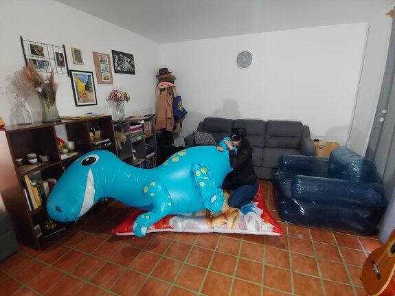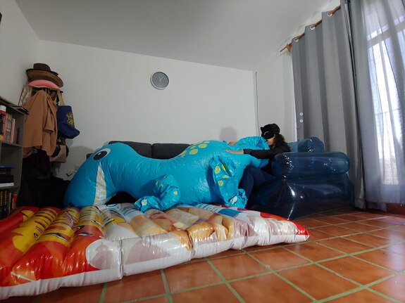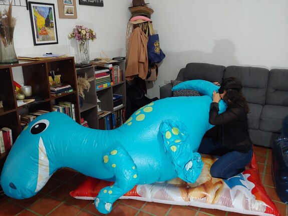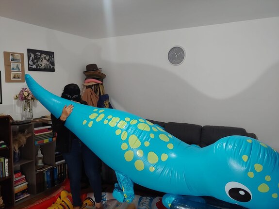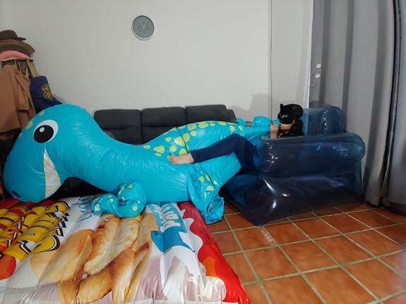 Alice had a great lung power ... so... in this time she look our big inflatable blue dino and she blow it up really big only by mouth blow!!