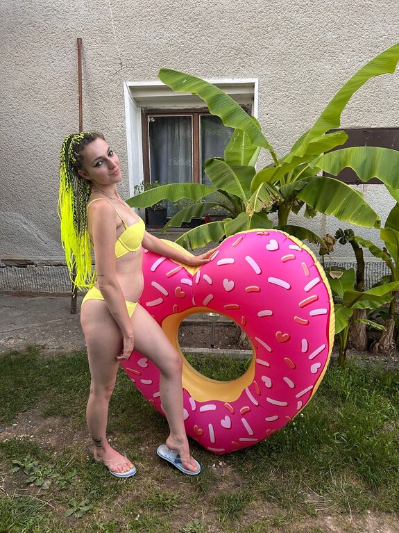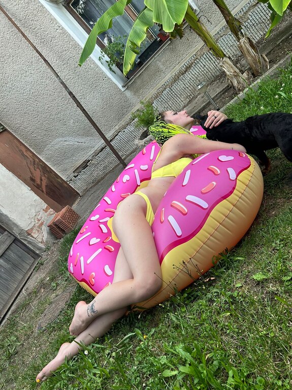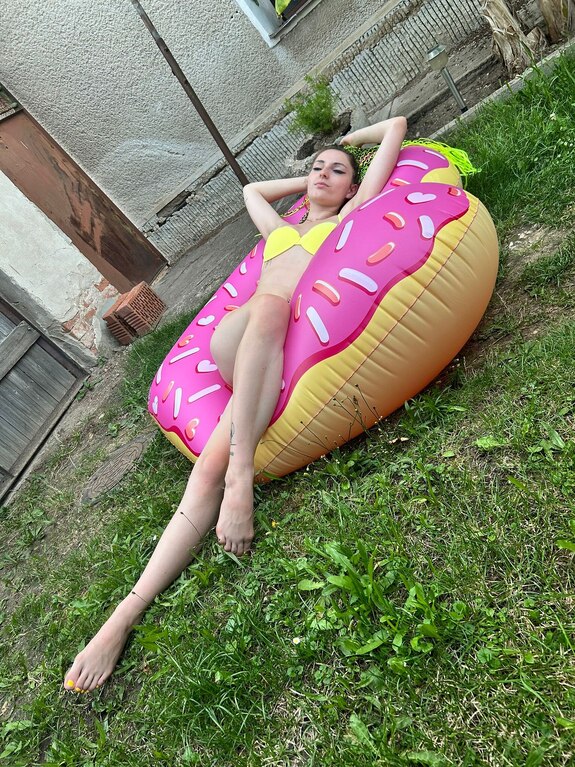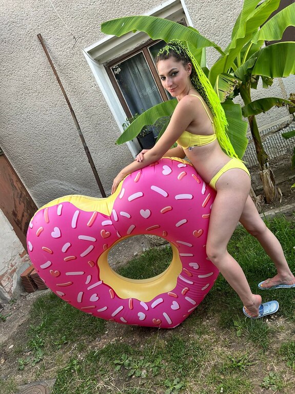 Lera photocollection with inflatables in the garden. Yellow bikini