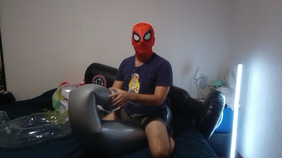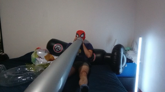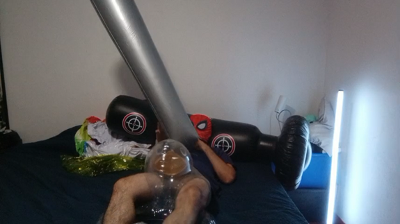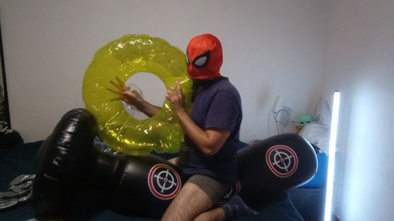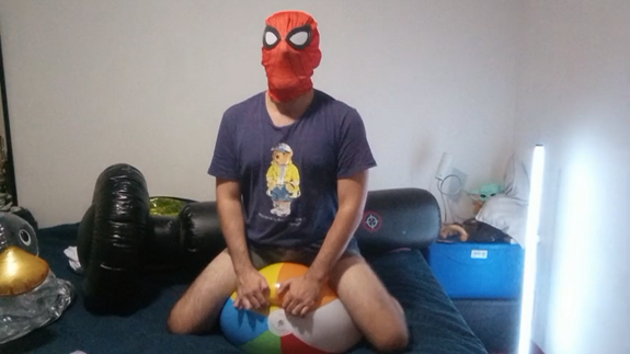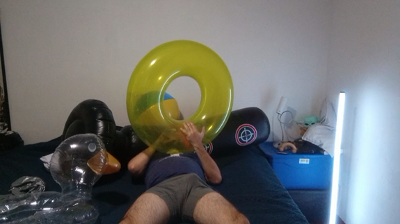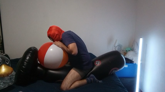 Mouth blow 3 inflatables: 1 swimming ring, 1 beachball (half blow it) one baseball bat, i ride them each one and pop them !!
