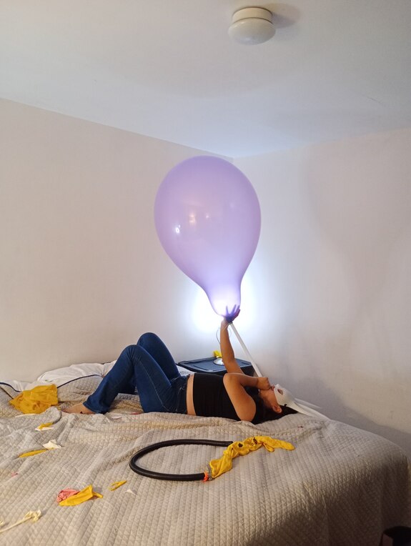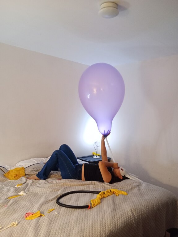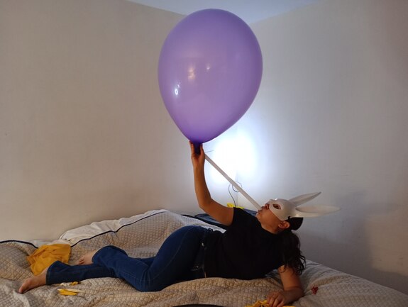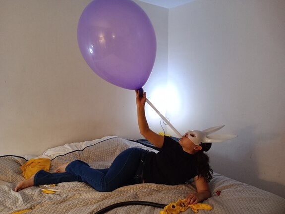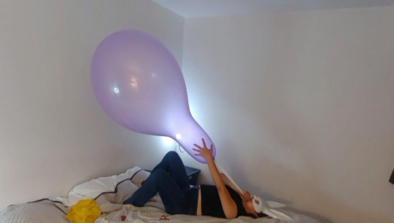 Alice mouth blow a big roomtex purple balloon of 24 inches really hot until pop!!!