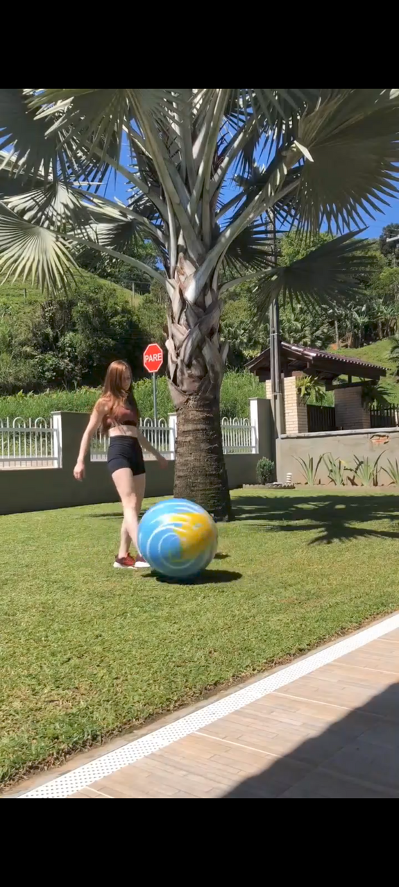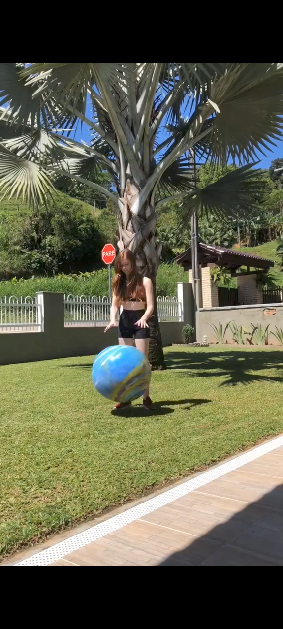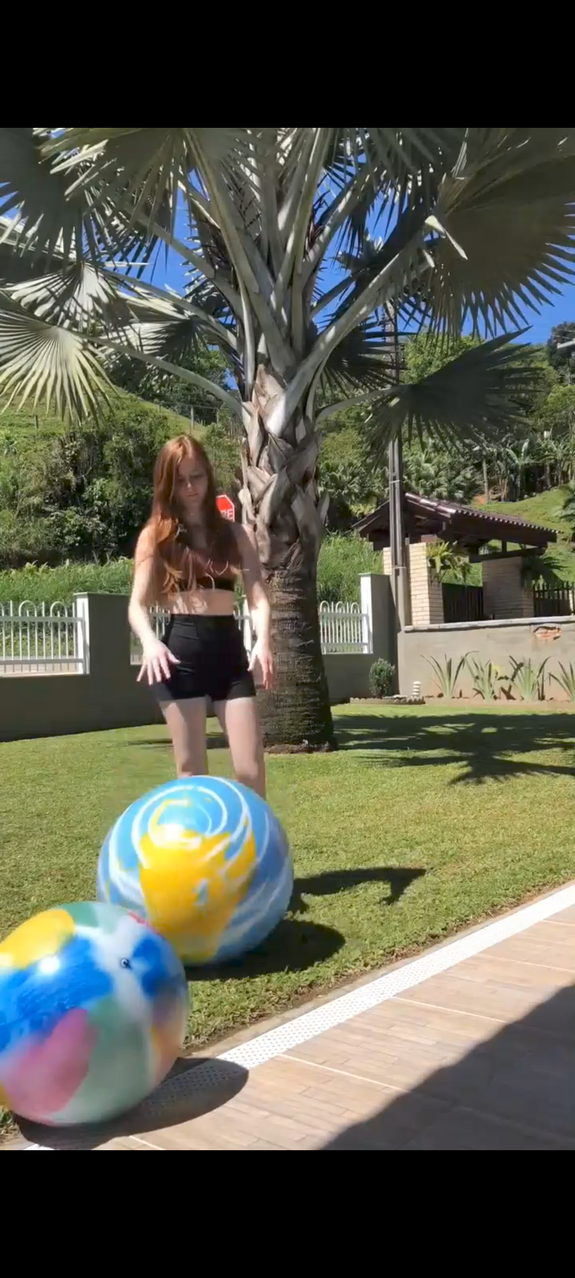 The girl plays with several balls in the grass of the house, but not everything is fun for some of the balls.