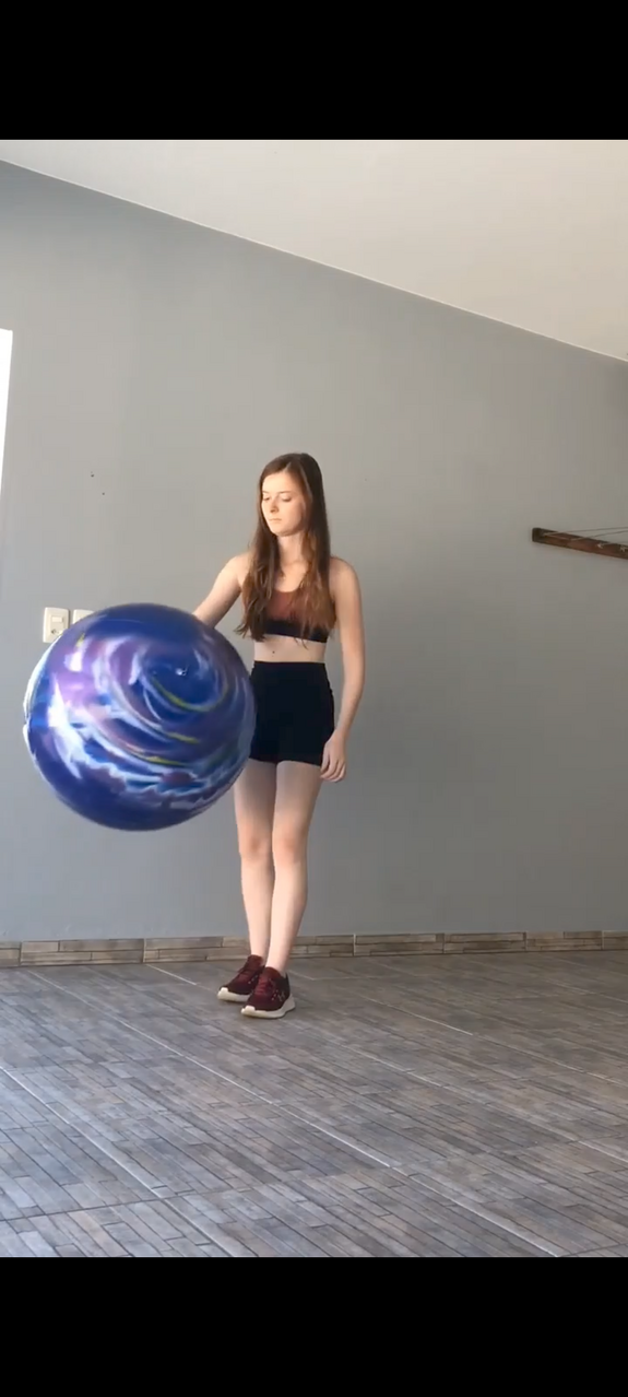 She also pops a red ball against a tree branch.