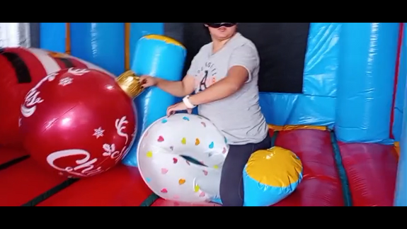 She was in the inflatable castle playing, riding and popping 2 swimming rings...