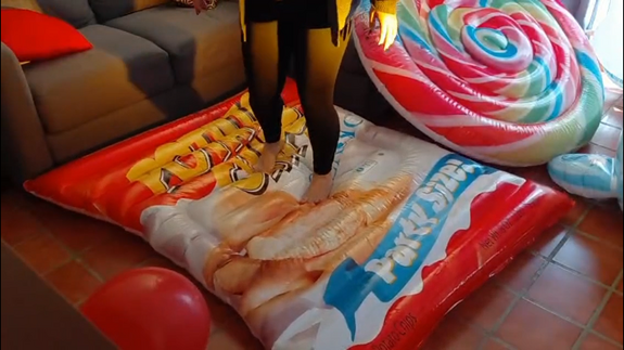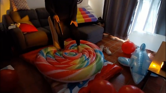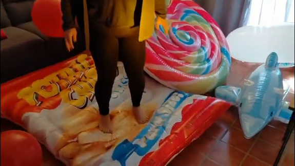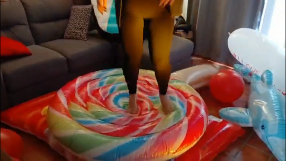 In this video Ary start jumping and playing with sneakers on then inflatables, then make the same barefeet , and the end she pop 2 inflatables with a knife!!!